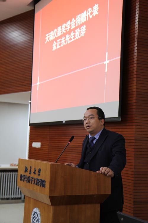 On January 14th, 2011, awarding ceremony of “Scholarship and Grants” for Year of 2009-2010 was held in College of Chemistry and Molecular Engineering, Peking University. Academician Mr. Xu Guangxian from China Academy of Sciences, Ms. Li Rong, Undersecretary of Education Foundation, Undersecretary Zha Jing of Student Affair Department, Deputy Secretary Sun Liqiang of University Youth League Committee, Director Yang Aimin of Students Patronage Center, College President Wu Kai, Party Secretary Liu Huwei, Vice President Zhu Tao and VP Fu Xuefeng, Party Undersecretary Ma Yuguo, Youth League Committee Secretary Bai Yu were invited to the awarding ceremony. Party Undersecretary Zhang Li hosted the ceremony and our corporation’s Deputy General Manager Mr. Yu Zhengdong attended the ceremony to present scholarship and grants on behalf of Skyray Instrument.