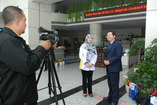 After the visit, Dr. Liu Zhao Gui, ministry Dr. Mashitah Ibrahim, Dr. Malek, premier of YaPEIM Co. Ltd, Mr.Abi,CEO of YaPEIM Co. Ltd, national bank consulter Zailan Mansor from Brunei had a conversation. “We are honored to have our guests from Malaysia. During the last year, Skyray had established a cooperation relationship of integrity and all-win with YaPEIM Co. Ltd, and long life our friendship.” So said Dr. Liu in his greetings. And ministry Dr. Mashitah Ibrahim said that although it is her first time to China, the creative research technology, passionate workers, tide and splendid environment really impressed her. She hopes that Malaysia can have further cooperation relationship with Skyray Instrument. After the conversation, they gave gift of good wishes to each other, and guests also asked Dr. Liu to talk before the video recorder as “perpetual memento”.